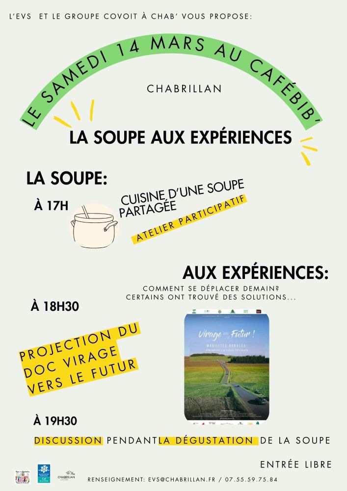 Soupe aux expériences – Mobilité – EVS 14 Mar 2026 | EVS 14/03/2026 17 h 00 Cafébib' ← retour à la liste