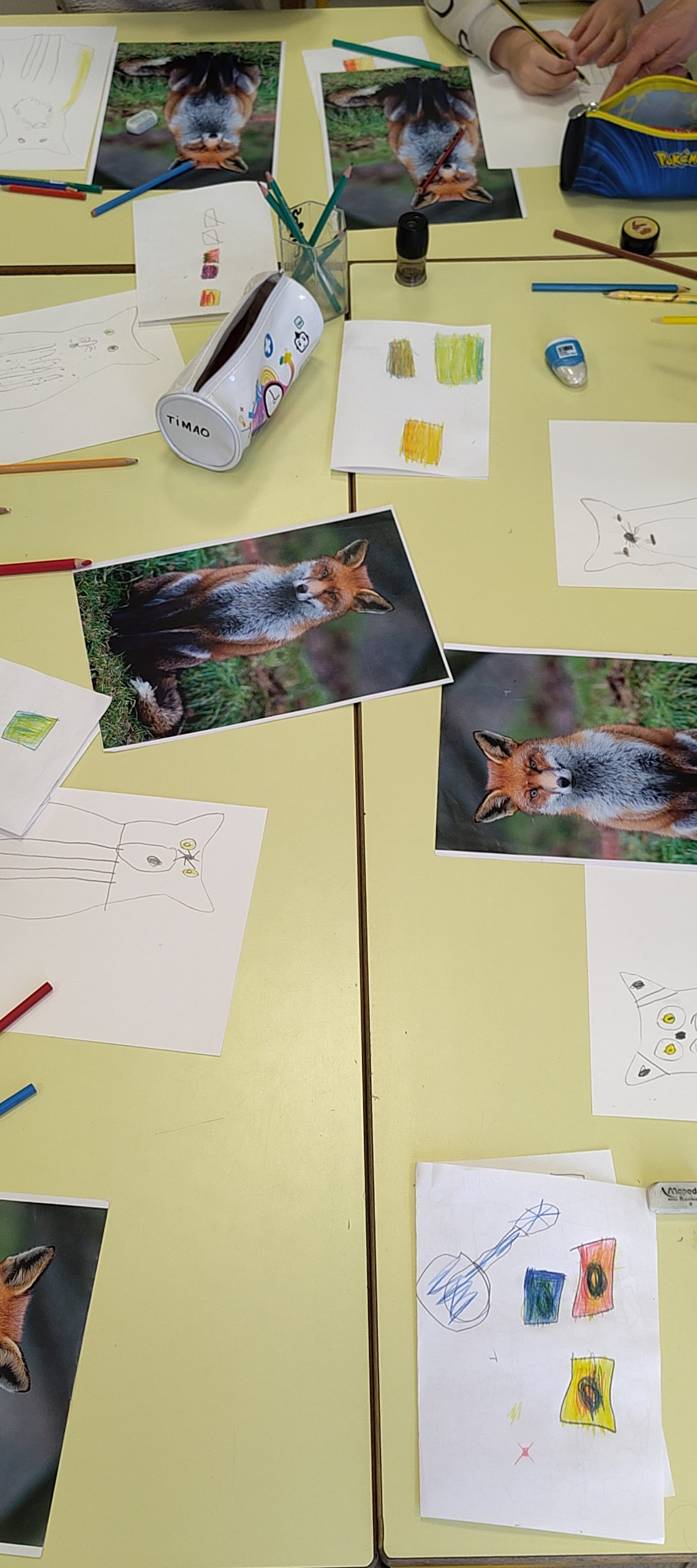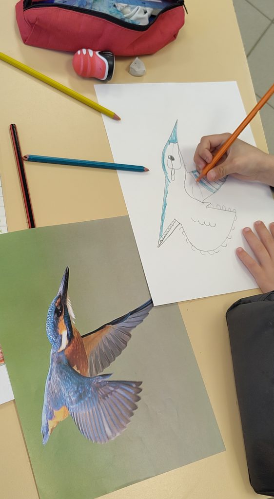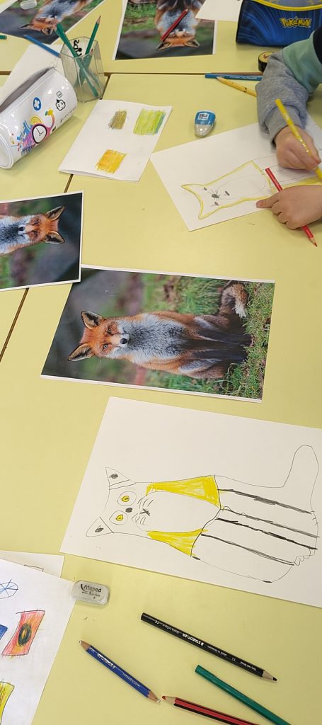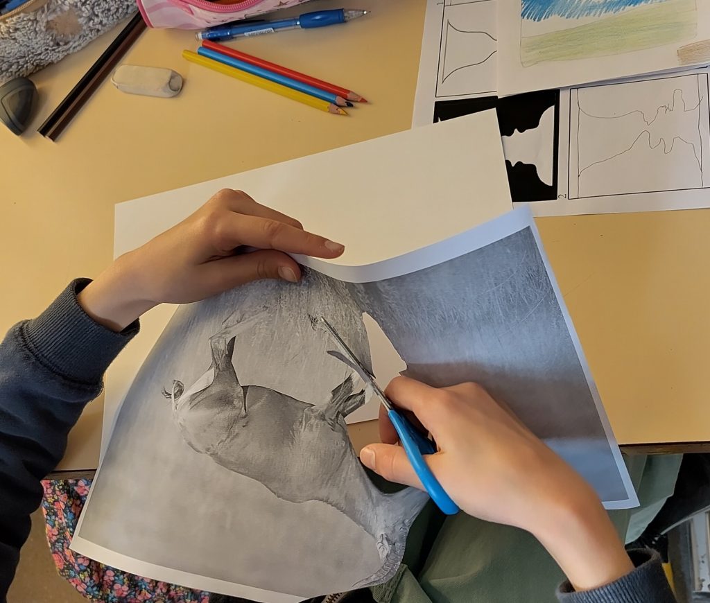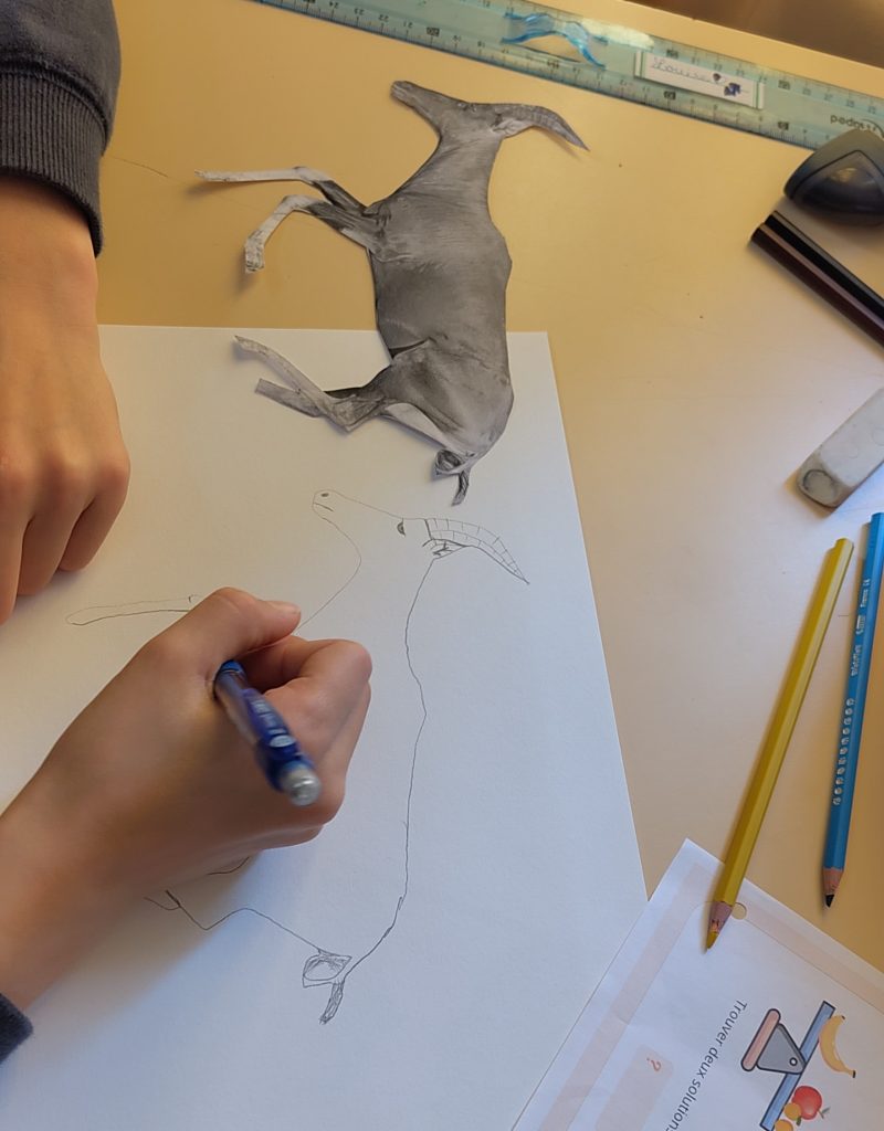 Elle a guidé les élèves à travers une approche progressive du regard et du geste. Après un échauffement (le dessin, c’est comme le sport : c’est du travail !), ils ont réalisé le dessin d’un animal à partir d’une photographie.