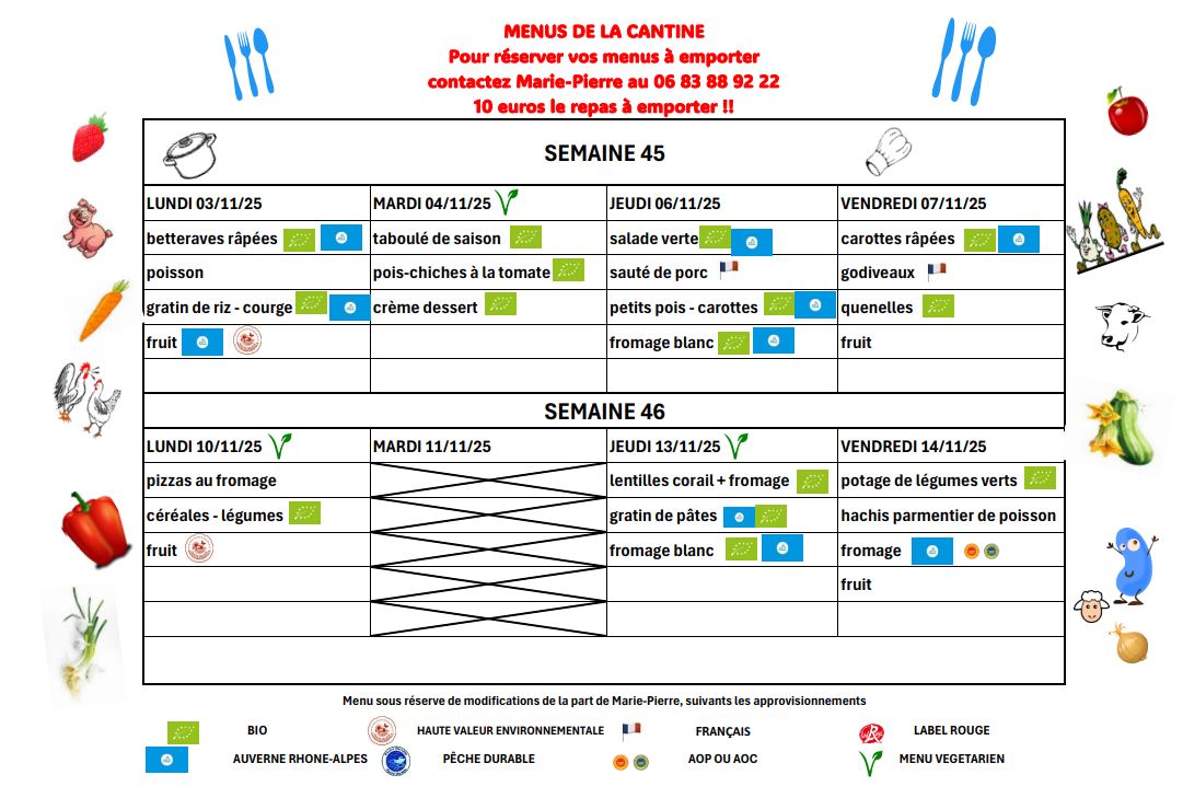 Pour 10 € : la cantine vous propose des repas à emporter à venir récupérer à la cantine à 11h30
